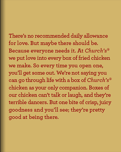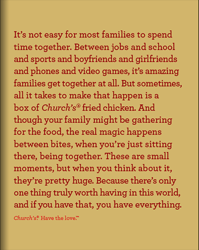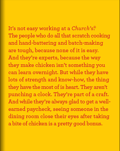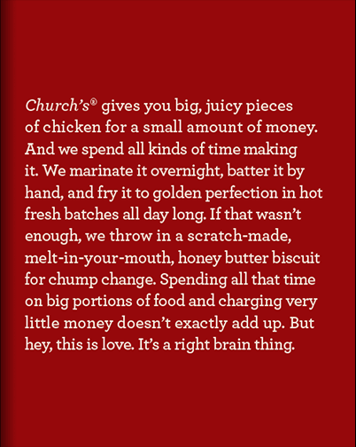 Cheap chicken. That was the perception people had when we first started working with Church's®. But we uncovered a truth about how they make their chicken that has completely changed how people view this delicious food. Church's® puts a lot of love into its food. And when someone bites into it, they get love out. A formula which, as it turns out, has translated into record-breaking sales numbers.